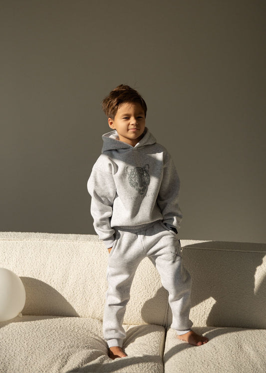 Šviesiai pilko melanžo spalvos kostiumėlis VAIKAMS su KAPIŠONU | Su pūkiu | PRE - ORDER
