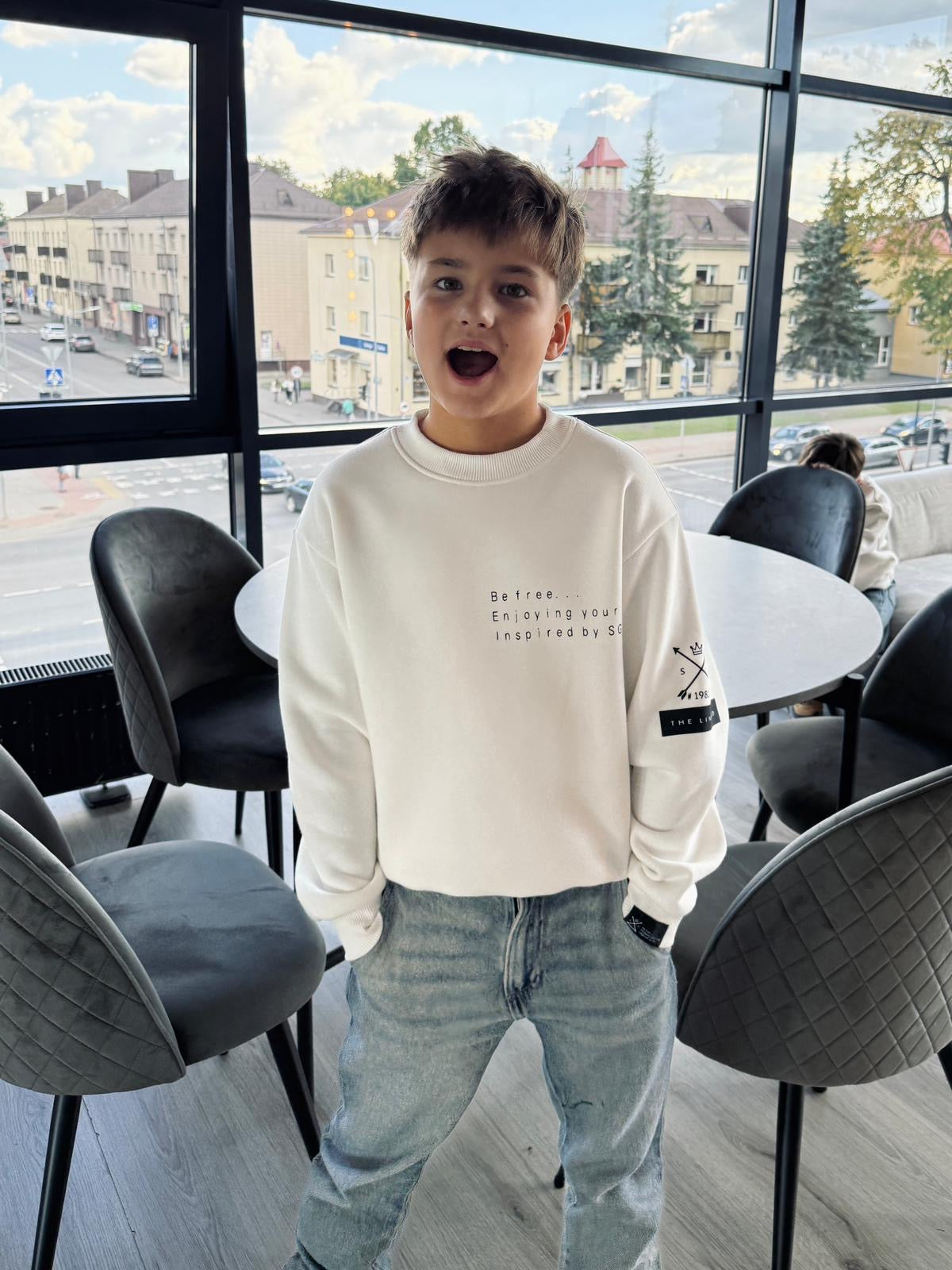 Pieno baltumo spalvos džemperis "su fraze" VAIKAMS be KAPIŠONO | PRE-ORDER