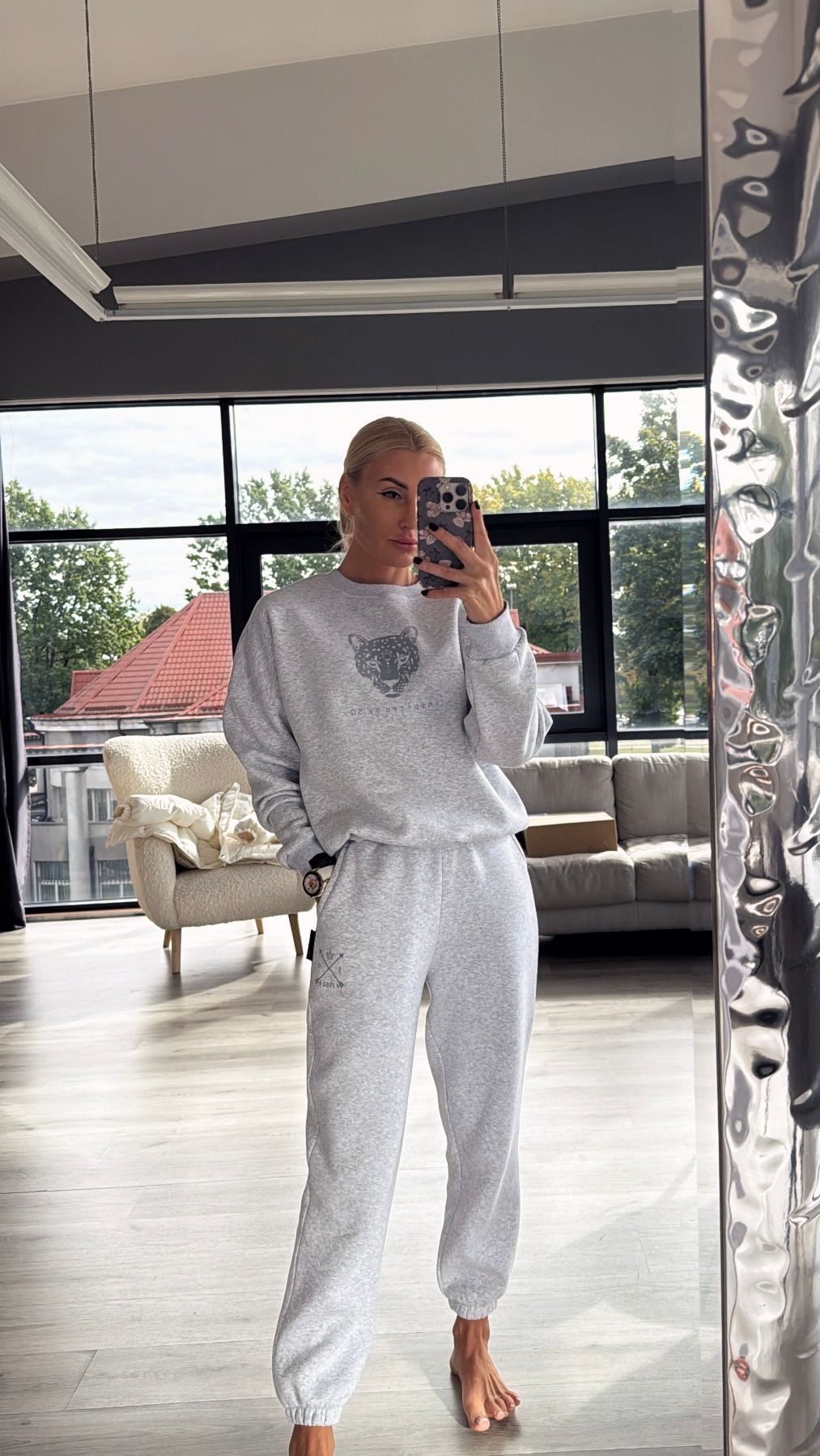 Šviesiai pilko melanžo spalvos kostiumėlis moterims su pūkiu | PRE - ORDER