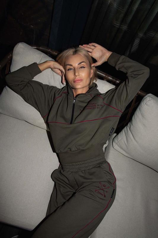 NETURIMEChaki kostiumėlis su bordo detalėmis
