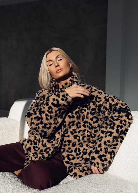 Leopardinis OVERSIZE teddy džemperis su pusiniu užtrauktuku